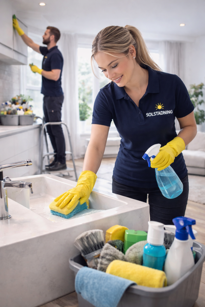 Städpersonal från Solstädning utför noggrann storstädning i ett hem med professionella rengöringsprodukter